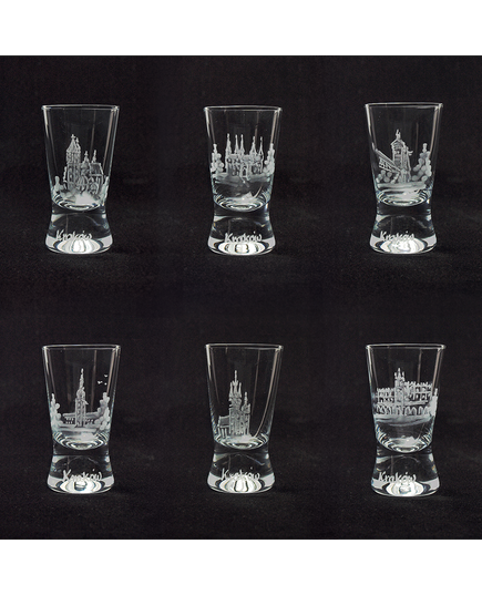 Kieliszki ręcznie grawerowane. Na każdym wygrawerowany został rysunek przedstawiający znane miejsce z Krakowa. Kieliszki sprzedawane w kompletach po 6 sztuk.